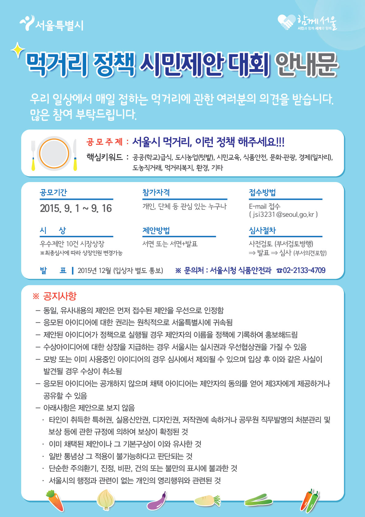 김창보 서울시 시민건강국장은 “먹거리에 대한 시민들의 생생한 의견을 듣고 정책에 반영하고자 이번 정책 제안 대회를 마련했다”며 “건강한 먹거리가 있는 살기 좋은 서울을 만들기 위해 톡톡 튀는 아이디어를 가진 시민들의 많은 참여를 바란다”고 말했다.