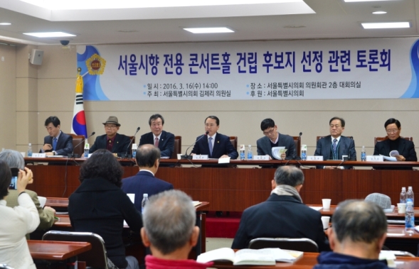 토론회는 김제리 의원이 좌장을 맡은 가운데 박대우 서울시 문화정책과장과 진용옥 경희대학교 명예교수, 김부중 한국정보통신역사학회 회장이 콘서트홀 후보지 선정과 관련 주제발표 후, 이대로 한글학회 이사, 홍성훈 종로문인협회 명예회장, 홍준식 서울시향 경영본부장의 지정 토론 순으로 진행되었다.