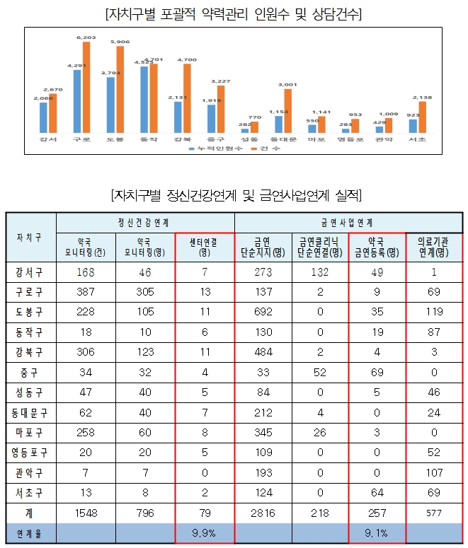서울시가 밝힌 성과 자료를 보면 약력관리 및 상담을 통해 자살위험자를 정신건강증진센터로 연결을 하는 사례도 증가하고 있고, 금연·체중조절 등의 생활습관 중재사례도 보고되는 등 상당한 성과가 있는 것으로 나타난다.