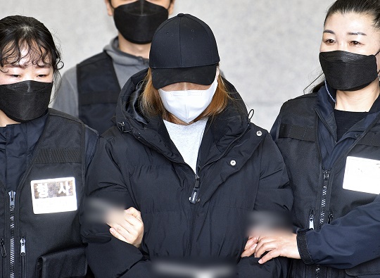 3월 17일 오후 경북 구미경찰서에서 3세 여아 사망사건의 친모인 석 아무개 씨가 호송 차량으로 이동하고 있다. 사진=연합뉴스