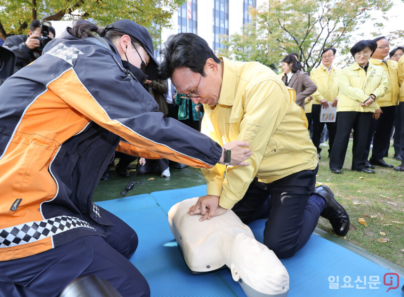 심폐소생술을 체험 하는 김민석 국무총리