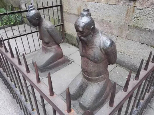 항저우 중심부에 세워져 있는 이 부부의 동상은 무릎을 꿇고 고개를 숙인 채 등 뒤로 손이 묶인 모습을 하고 있다. 영원히 굴욕을 당하고 있는 부부의 모습을 형상화한 것이다. 하지만 그것만으로는 벌이 충분하지 않았던 모양. 이 주철로 만든 동상은 매일 수백, 때로는 수천 명의 방문객들에게 수모를 겪고 있다.