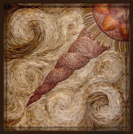 현재 노팅엄의 잔놀리 갤러리에서 열리고 있는 회고전 ‘퀴버’에서 깃털이 핵심적인 역할을 맡고 있는 것도 이런 이유에서다. 매끈하고 뱀 같은 형상에서부터 초현실적인 뼈 구조의 소용돌이에 이르기까지 유기적 형태를 구현했다. 가령 맥과이어가 가장 좋아하는 작품 가운데 하나는 2004년에 제작된 ‘브루드 36데이즈’로, 수천 개의 위시본(Y자 모양의 가슴뼈)을 복잡한 나선형으로 정교하게 엮어 제작한 작품이다.