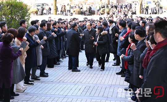 동료 의원 응원받으며 영장심사 출석하는 추경호