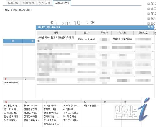경기도가 판교 환풍구 붕괴 추락 사고가 발생한 판교 테크노밸리 축제 행사에 직접적으로 개입하지 않았다고 주장하는 가운데 지난 14일 경기도이야기 홈페이지 보도캘린더에만 보도자료 흔적이 있어 논란이 되고 있다.<사진=경기도이야기>