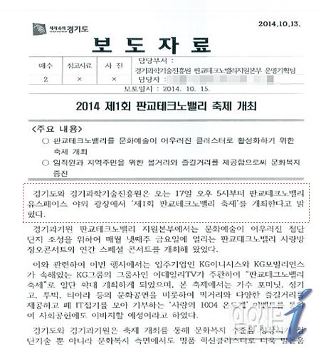 경기도가 지난 17일 27명의 사상자를 낸 판교 환풍구 붕괴 사고 행사에 개입한 사실이 없다고 공식 발표한 가운데 14일 보도 자료를 발송한 사실이 드러났다. 또 이러한 사실을 은폐하기 위해 보도 자료와 홍보물을 수정․삭제한 흔적이 나타나 충격을 주고 있다.