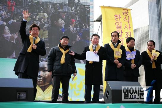 이재명 성남시장은 3월 1일 오후 3시 서울 청계광장에서 전국행동(정신대문제대책협의회 등 400개 단체 연합) 주최·주관으로 열린 ‘3.1절 한일 일본군 위안부 합의 무효 전국 행동의 날’ 행사에 참석해 이같이 밝혔다.
