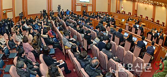 [일요신문] 10일 오전 서울 종로구 헌법재판소에서 박근혜 대통령 탄핵심판 3차 공개 변론이 열리고 있다. 이날 헌법재판소는 오전 중 대통령 대리안단이 제출한 박 대통령의 ‘세월호 7시간 행적’ 답변서를 검토할 예정이다. 2017.1.10 고성준 기자