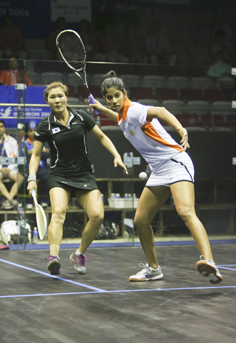 [일요신문] 26일 인천 열우물스쿼시경기장에서 열린 2014 인천 아시안게임 스쿼시 여자 단체 4강전에서 한국 박은옥이 인도 치나파 조샤나와 경기를 펼치고 있다. 이 경기에서 인도에 0-2로 패했지만, 비인기종목의 설움을 깨고 아시안게임 2회 연속 메달을 차지했다.